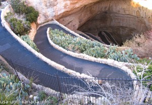 - Die Kammern der Carlsbad Caverns. Über einen künstlichen Höhleneingang, direkt unter dem ganzjährig geöffneten Besucherzentrum wird man über einen Personenaufzug in 230 m Tiefe und zurück gebracht oder man bewältigt den Abstieg auf einer 3 km langen Strecke durch den Bat Cave.
